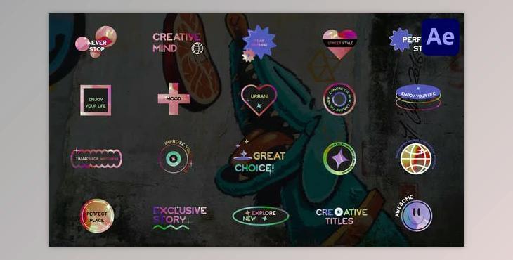 Holographic Sticker Titles for AE VH-52121070: This videohive package is a collection designed to elevate your videos with a touch of the extraordinary. This template is perfect for fashion shows, social media posts, and creative video projects, featuring modern holographic text animations in various abstract shapes and gradient iridescent colours.